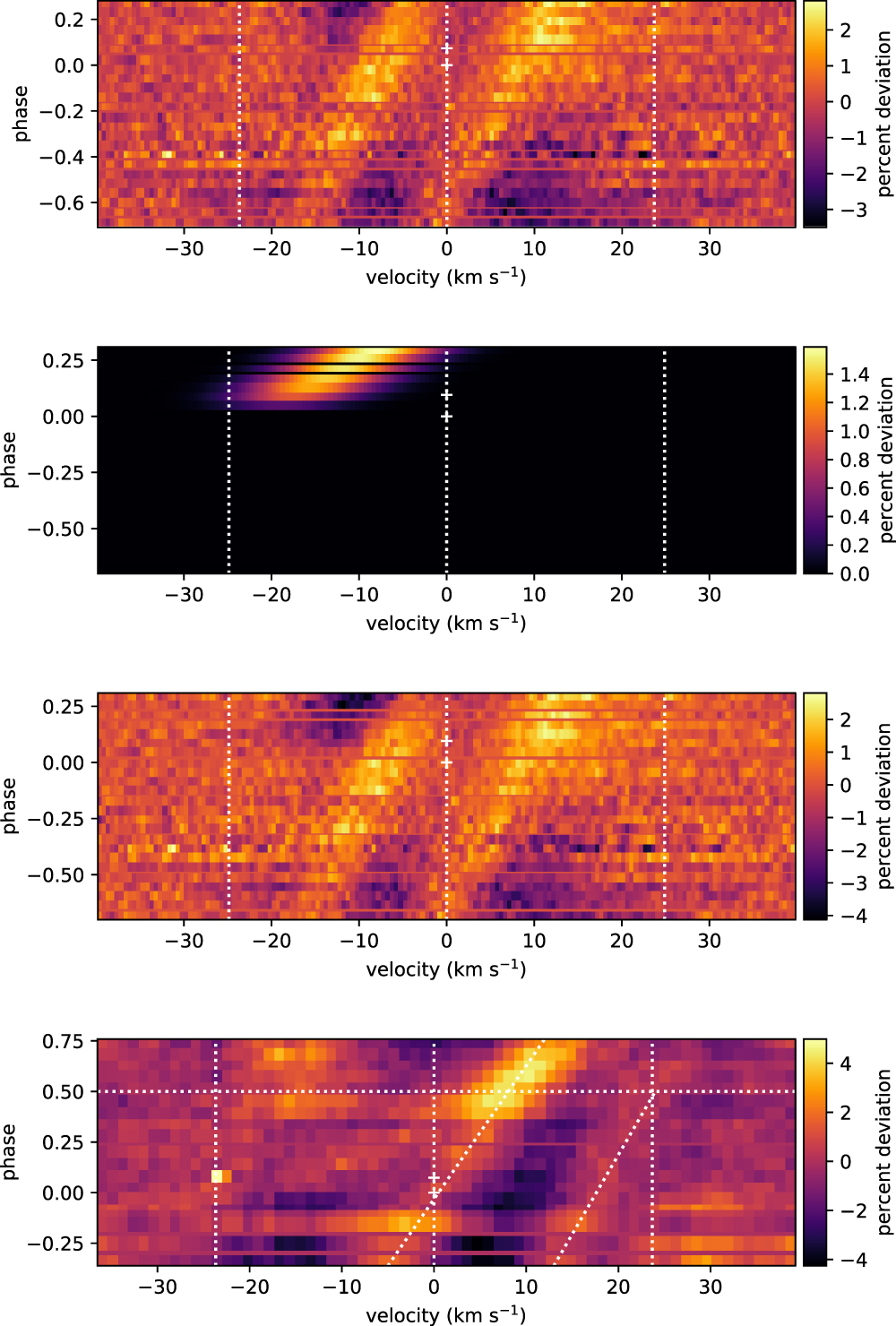 Doppler tomographic data from PEPSI (top three panels) and HIRES (bottom). All plots show the time-series line profile residuals, i.e., each horizontal line shows the deviation of the line profile from the average line profile at that time. Time increases from bottom to top; units are such that ingress = 0 and egress = 1. The vertical dotted lines show v = 0, ±$v sin i_star, the horizontal dotted line the time of mid-transit, and the two small plus signs first and second contact. In the HIRES plot we also show two slanted dotted lines to guide the eye along the spot signatures, which are less obvious than in the PEPSI data.